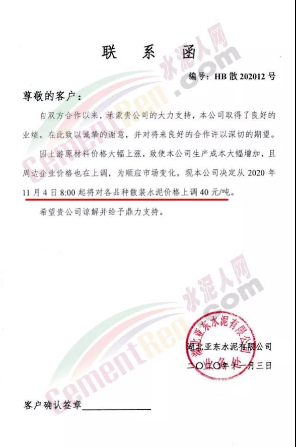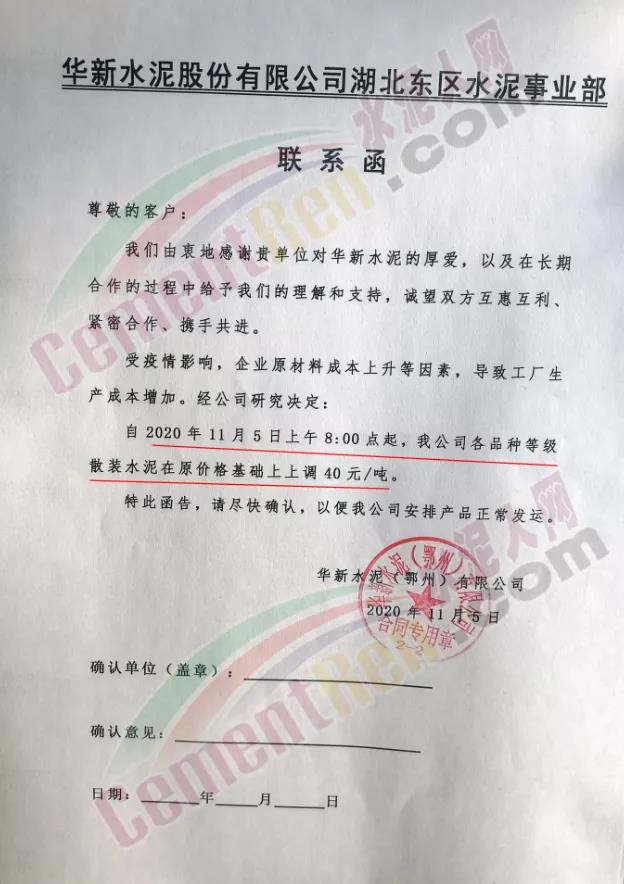華新水泥湖北東區(qū)水泥事業(yè)部鄂州公司、黃石分公司、大冶公司聯(lián)系函稱(chēng),受疫情影響,企業(yè)原材料成本上升等因素,導(dǎo)致工作生產(chǎn)成本增加,經(jīng)公司研究決定 ,自11月5日上午8時(shí)起,公司各品種等級(jí)散裝水泥在原價(jià)基礎(chǔ)上上調(diào)40元/噸。