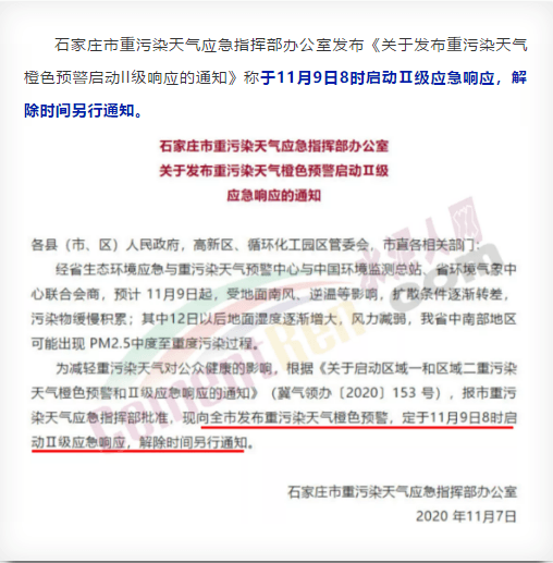 石家莊市11月9日8時(shí)啟動(dòng)Ⅱ級(jí)應(yīng)急響應(yīng),解除時(shí)間另行通知