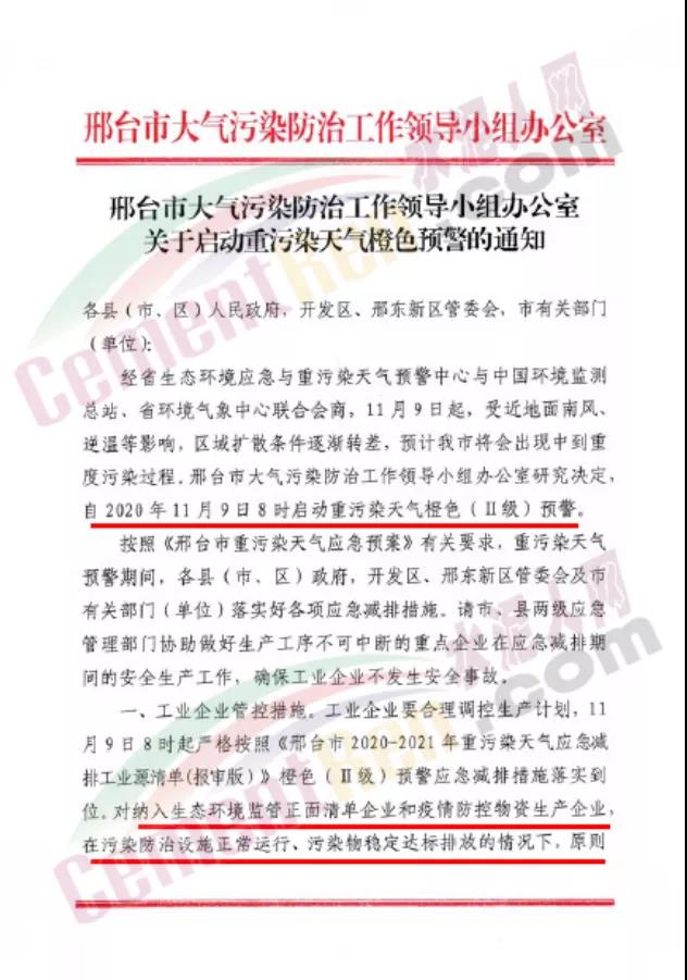 邯鄲市重污染天氣應(yīng)急指揮部通知,于11月9日8時(shí)起啟動(dòng)Ⅱ級(jí)應(yīng)急響應(yīng),在確保安全生產(chǎn)的前提下,全市域嚴(yán)格按照應(yīng)急減排有關(guān)要求落實(shí)各項(xiàng)應(yīng)急減排措施。工業(yè)企業(yè)合理調(diào)控生產(chǎn)計(jì)劃,在確保安全生產(chǎn)和民生保障的前提下,按照《邯鄲市2020-2021年重污染天氣應(yīng)急減排工業(yè)源清單(修訂版)》橙色預(yù)警(Ⅱ級(jí))差異化減排措施執(zhí)行到位。
