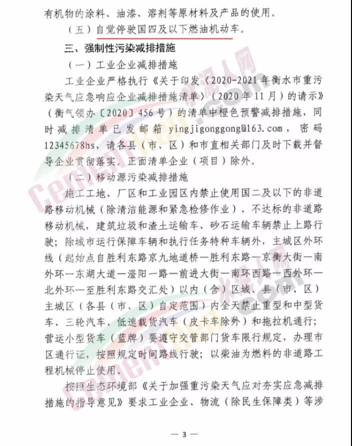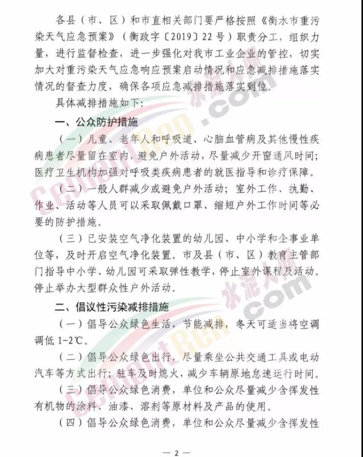 衡水市大氣污染防治工作領(lǐng)導(dǎo)小組辦公室發(fā)文:定于2020年11月9日8時(shí)啟動(dòng)Ⅱ級(jí)應(yīng)急響應(yīng),解除時(shí)間另行通知。工業(yè)企業(yè)嚴(yán)格按照《2020-2021年衡水市工業(yè)企業(yè)應(yīng)急減排清單(報(bào)審版)》的清單中橙色預(yù)警減排措施執(zhí)行。除應(yīng)急搶險(xiǎn)外,建成區(qū)停止所有施工工地的土石方作業(yè)(包括:停止土石方開挖、回填、場(chǎng)內(nèi)倒運(yùn)、摻拌石灰、混凝土剔鑿、改造、建筑工程配套道路和管溝開挖等作業(yè))、建筑拆除、噴涂粉刷、護(hù)坡噴漿、混凝土攪拌等。