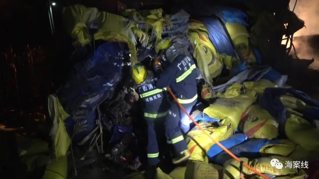 當(dāng)天凌晨2點(diǎn)51分,都安安陽(yáng)消防救援站接到警情后,立即趕赴現(xiàn)場(chǎng)救援。在事故現(xiàn)場(chǎng),一輛運(yùn)載水泥的掛車(chē)與一輛運(yùn)載化肥的貨車(chē)迎面相撞,水泥掛車(chē)燃起熊熊大火,兩人被困火中無(wú)法逃生;運(yùn)化肥的貨車(chē)則是側(cè)翻在一旁,車(chē)頭已嚴(yán)重變形,一人被困駕駛室內(nèi),情況十分緊急。
