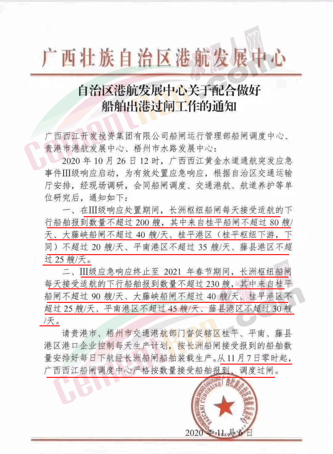 日前,廣西壯族自治區(qū)港航發(fā)展中心發(fā)布《自治區(qū)港航發(fā)展中心關(guān)于配合做好船舶出港過(guò)閘工作的通知》稱(chēng),2020年10月26日12時(shí),廣西西江黃金水道通航突發(fā)應(yīng)急事件Ⅲ級(jí)響應(yīng)啟動(dòng),為有效處置應(yīng)急響應(yīng),根據(jù)自治區(qū)交通運(yùn)輸廳安排,經(jīng)現(xiàn)場(chǎng)調(diào)研,會(huì)同船閘調(diào)度、交通港航、航道養(yǎng)護(hù)等單位研究后,要求在Ⅲ級(jí)響應(yīng)處置期間,長(zhǎng)洲樞紐船閘每天接受適航的下行船舶報(bào)到數(shù)量不超過(guò)200艘,其中來(lái)自桂平船閘不超過(guò)80艘/天、大藤峽船閘不超過(guò)40艘/天、桂平港區(qū)(桂平樞紐下游,下同)不超過(guò) 20艘/天、平南港區(qū)不超過(guò)35艘/天、藤縣港區(qū)不超過(guò)25艘/天。二、Ⅲ級(jí)應(yīng)急響應(yīng)終止至 2021年春節(jié)期間,長(zhǎng)洲樞紐船閘每天接受適航的下行船舶報(bào)到數(shù)量不超過(guò)230艘,其中來(lái)自桂平船閘不超過(guò) 90艘/天、大藤峽船閘不超過(guò)40艘/天、桂平港區(qū)不超過(guò)25艘/天、平南港區(qū)不超過(guò)45艘/天、藤縣港區(qū)不超過(guò)30艘/天。請(qǐng)貴港市、梧州市交通港航部門(mén)督促轄區(qū)桂平、平南、藤縣港區(qū)港口企業(yè)控制每天生產(chǎn)計(jì)劃,按長(zhǎng)洲船閘接受報(bào)到的船舶數(shù)量安排好每日下航經(jīng)長(zhǎng)洲船閘船舶裝載生產(chǎn)。從11月7日零時(shí)起,廣西西江船閘調(diào)度中心嚴(yán)格按數(shù)量接受船舶報(bào)到、調(diào)度過(guò)閘。