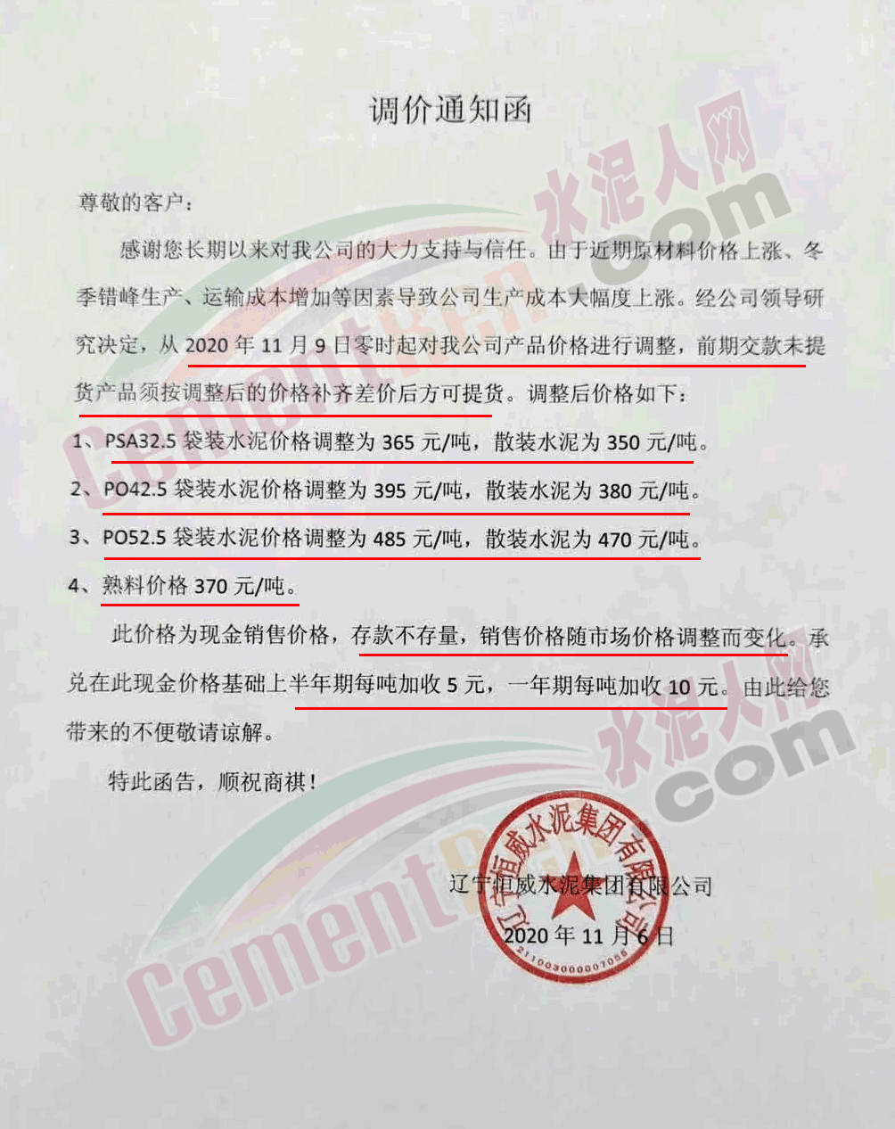 遼寧恒威水泥集團(tuán)調(diào)價(jià)通知稱(chēng),由于近期原材料價(jià)格上漲、冬季錯(cuò)峰生產(chǎn)、運(yùn)輸成本增加等因素導(dǎo)致公司生產(chǎn)成本大幅度上漲。經(jīng)公司領(lǐng)導(dǎo)研究決定,從2020年11月9日零時(shí)起對(duì)公司產(chǎn)品價(jià)格進(jìn)行調(diào)整,前期交款未提貨產(chǎn)品須按調(diào)整后的價(jià)格補(bǔ)齊差價(jià)后方可提貨。調(diào)整后價(jià)格如下∶1、PSA32.5袋裝水泥價(jià)格調(diào)整為365元/噸,散裝水泥為350元/噸。2、PO42.5袋裝水泥價(jià)格調(diào)整為395元/噸,散裝水泥為380元/噸。3、PO52.5袋裝水泥價(jià)格調(diào)整為485元/噸,散裝水泥為470元/噸。4、熟料價(jià)格370元/噸。此價(jià)格為現(xiàn)金銷(xiāo)售價(jià)格,存款不存量,銷(xiāo)售價(jià)格隨市場(chǎng)價(jià)格調(diào)整而變化。承兌在此現(xiàn)金價(jià)格基礎(chǔ)上半年期每噸加收5元,一年期每噸加收10元。
