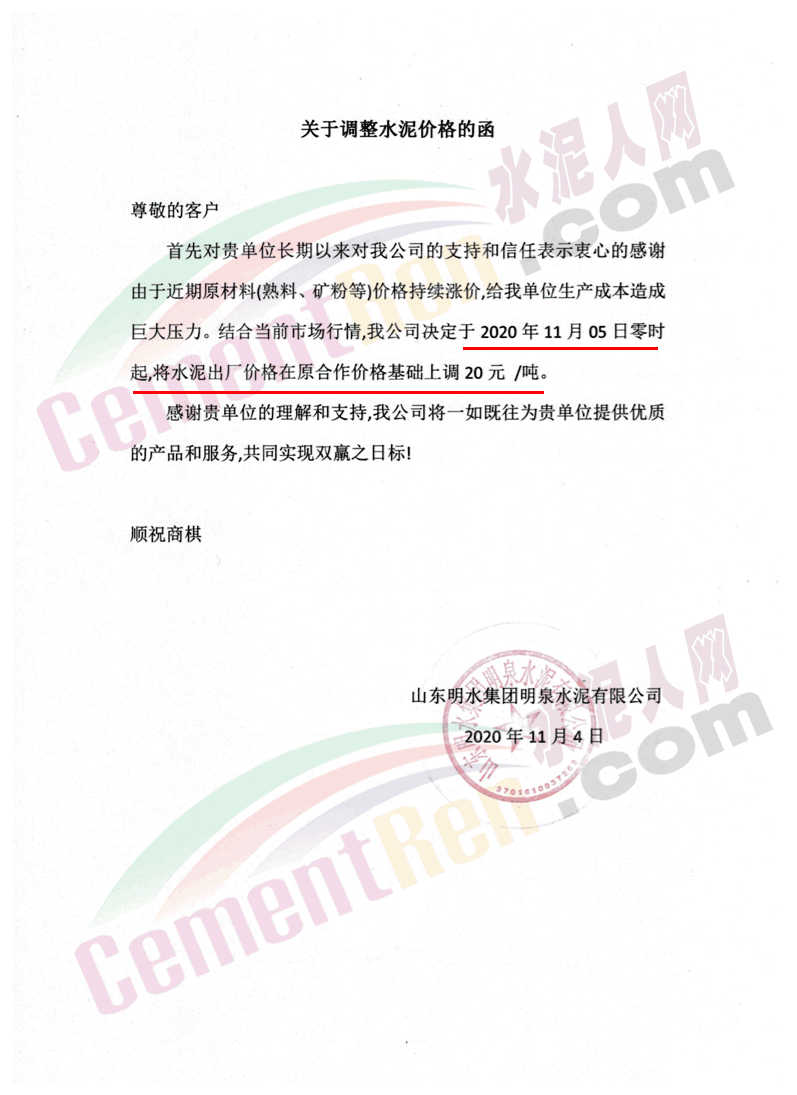 山東明水集團(tuán)明泉水泥有限公司水泥調(diào)價(jià)函稱(chēng),由于近期原材料(熟料、礦粉等)價(jià)格持續(xù)漲價(jià),給企業(yè)生產(chǎn)成本造成巨大壓力。結(jié)合當(dāng)前市場(chǎng)行情,決定于2020年11月05日零時(shí)起,將水泥出廠價(jià)格在原合作價(jià)格基礎(chǔ)上調(diào)20元 /噸。