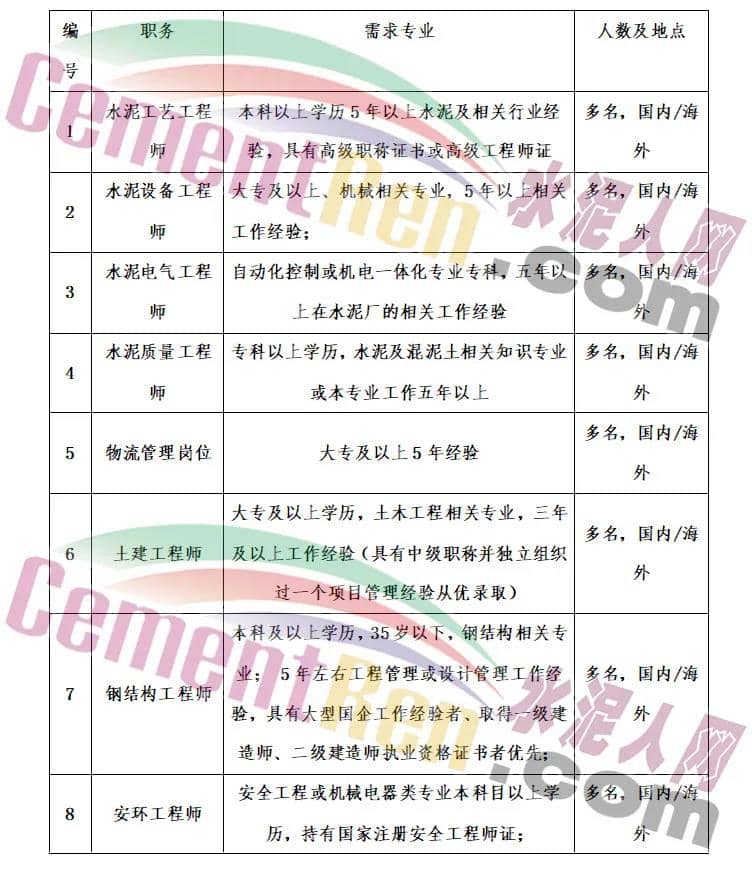 堯柏水泥招聘包括水泥工藝、設(shè)備、電氣、土建、鋼結(jié)構(gòu)、安環(huán)、自動化、智能化、水泥研發(fā)工程師和辦公室主任、財(cái)務(wù)經(jīng)理、市場經(jīng)理、人力資源經(jīng)理等行政崗位共計(jì)17個崗位多名員工,且有機(jī)會赴海外項(xiàng)目部工作。
