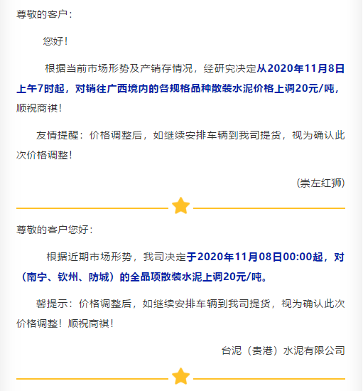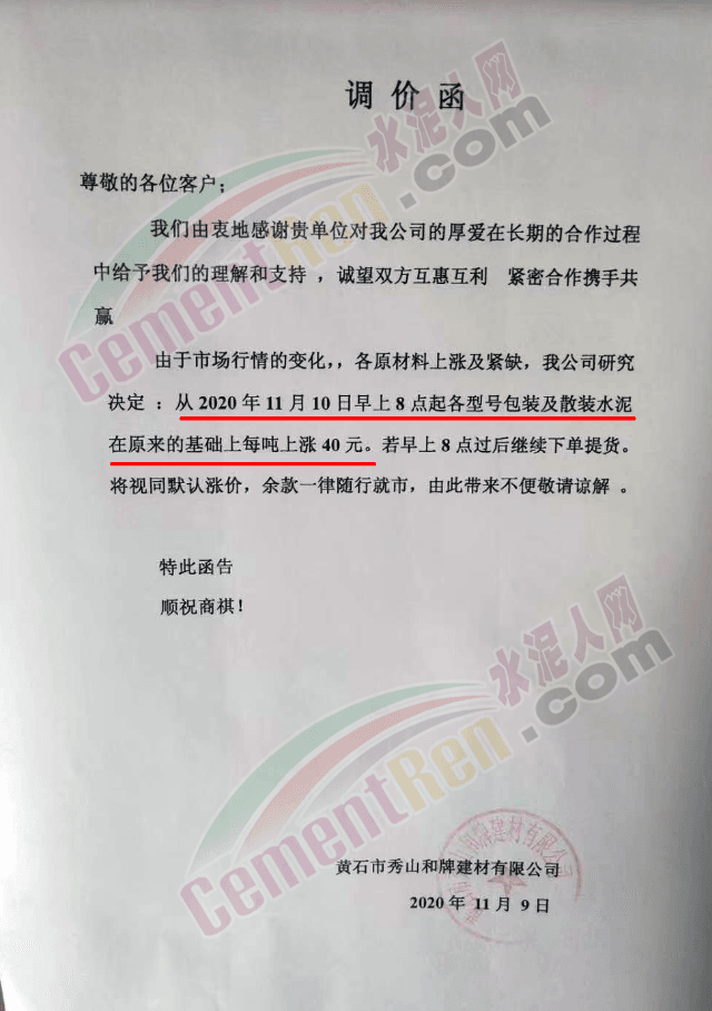 伊通滿族自治縣主要品牌企業(yè)通知下游商砼客戶稱,受道路交通限載及環(huán)保要求等因素影響,水泥原材料及運輸成本大幅上漲,尤其入冬以來煤炭成本漲幅巨大,導致水泥生產(chǎn)成本增加,為公司正常生產(chǎn)經(jīng)營帶來壓力。為緩解生產(chǎn)經(jīng)營成本壓力,保證公司正常運營及出廠水泥質量,經(jīng)公司研究決定上調PO2.5裝水泥出廠價160元/噸,運費同步上調20元/噸。
