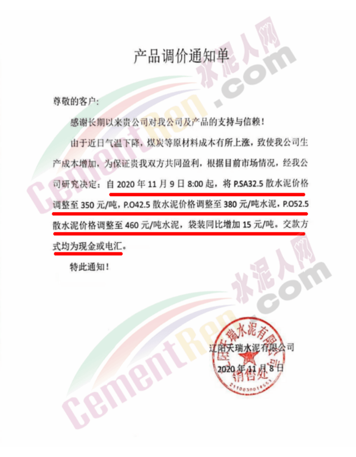 近兩日遼寧區(qū)域主要品牌企業(yè)陸續(xù)通知上調水泥價格,且有企業(yè)表示庫存量有限,本月15日前后或再漲一次。遼陽天瑞水泥通知,由于近日氣溫下降,煤炭等原材料成本有所上漲,致使工廠生產(chǎn)成本增加。自11月9日時起,將P.S.A散裝水泥價格上調至350元/噸,P.O42.5散裝水泥上調至380元/噸,P.O52.5散裝水泥上調至460元/噸,袋裝同比增加15元/噸。交款方式必須為現(xiàn)金或電匯。