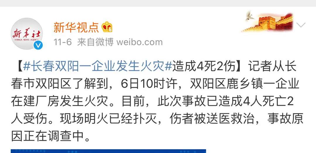 11月6日10時許,吉林省長春市雙陽區(qū)鹿鄉(xiāng)鎮(zhèn)一企業(yè)在建廠房發(fā)生火災(zāi)。目前,此次事故已造成4人死亡2人受傷?,F(xiàn)場明火已經(jīng)撲滅,傷者被送醫(yī)救治,事故原因正在調(diào)查中。