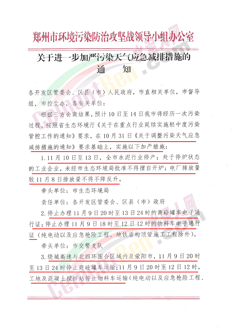 同日,鄭州市環(huán)境污染防治攻堅(jiān)戰(zhàn)領(lǐng)導(dǎo)小組辦公室發(fā)布《關(guān)于進(jìn)一步加嚴(yán)污染天氣應(yīng)急減排措施的通知》稱, 按照省生態(tài)環(huán)境廳《關(guān)于在重點(diǎn)行業(yè)延續(xù)實(shí)施輕中度污染管控工作的通知》要求,在10月31日《關(guān)于調(diào)整污染天氣應(yīng)急減排措施的通知》要求基礎(chǔ)上,實(shí)施加嚴(yán)措施: