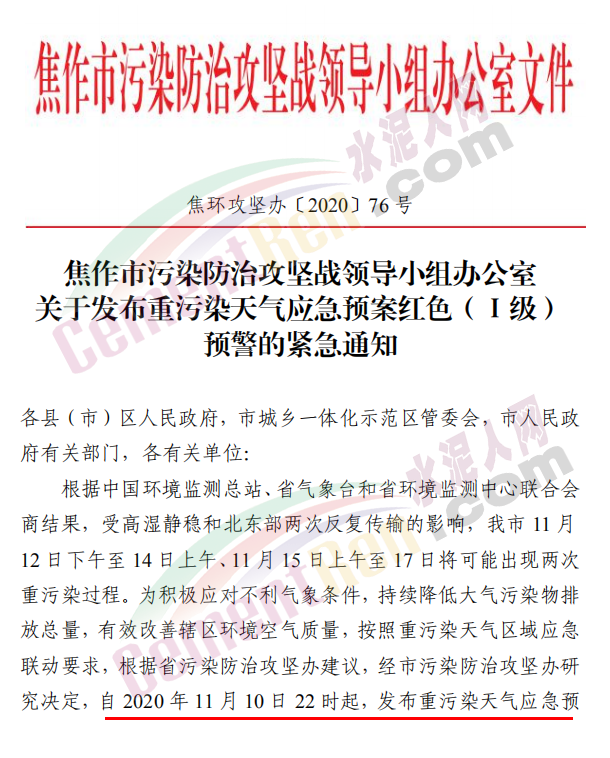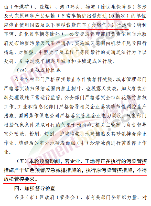 焦作市污染防治攻堅(jiān)戰(zhàn)領(lǐng)導(dǎo)小組辦公室發(fā)布《關(guān)于發(fā)布重污染天氣應(yīng)急預(yù)案紅色(Ⅰ級(jí))預(yù)警的緊急通知》稱,根據(jù)省污染防治攻堅(jiān)辦建議,經(jīng)焦作市污染防治攻堅(jiān)辦研究決定,自 2020 年 11 月 10 日 22 時(shí)起,發(fā)布重污染天氣應(yīng)急預(yù)案紅色(Ⅰ級(jí))預(yù)警,解除時(shí)間另行通知。各縣(市、區(qū))政府、 管委會(huì)及市有關(guān)部門要立即采取應(yīng)急減排措施。工業(yè)源減排措施方面要求各縣(市)區(qū)人民政府、市城鄉(xiāng)一體化示范區(qū)管委會(huì)應(yīng)當(dāng)按 照重污染天氣預(yù)警要求,實(shí)施Ⅰ級(jí)應(yīng)急響應(yīng),嚴(yán)格落實(shí)所在轄區(qū)2020 年最新修訂的重污染天氣應(yīng)急減排措施清單中的紅色預(yù)警停、限產(chǎn)措施。不可臨時(shí)中斷的生產(chǎn)線或生產(chǎn)工序,相關(guān)企業(yè)應(yīng)調(diào)整生產(chǎn)計(jì)劃,確保生產(chǎn)安全運(yùn)行的前提下,實(shí)施最大限度的污染物減排措施。預(yù)警期間,嚴(yán)禁工業(yè)企業(yè)新開生產(chǎn)線或運(yùn)行新的生產(chǎn)設(shè)備, 對(duì)于重污染天氣績(jī)效評(píng)級(jí) A 級(jí)、績(jī)效引領(lǐng)、民生保障等企業(yè), 原則上鼓勵(lì)企業(yè)自主減排和僅準(zhǔn)許特定保障任務(wù)的生產(chǎn)經(jīng)營(yíng)。長(zhǎng)期停產(chǎn)及未建成企業(yè)復(fù)產(chǎn)或試生產(chǎn)前,須向縣(區(qū))、市兩級(jí)污染防治攻堅(jiān)辦報(bào)告,經(jīng)同意后方可進(jìn)行。揚(yáng)塵源減排措施方面要求礦山、砂石料廠、石材廠、石板廠等應(yīng)停止露天作業(yè);施工工地停止室外作業(yè)。建筑垃圾清運(yùn)車輛和砂石運(yùn)輸車輛禁止上路行駛。開挖土石方的挖掘機(jī)等非道路移動(dòng)機(jī)械停止作業(yè)。施工工地內(nèi)停止使用國(guó)二及以下非道路移動(dòng)機(jī)械。移動(dòng)源減排措施要求工業(yè)企業(yè)廠區(qū)和工業(yè)園區(qū)內(nèi)禁止使用不達(dá)標(biāo)非道路移動(dòng)機(jī)械、禁止使用國(guó)二及以下非道路移動(dòng)機(jī)械,重點(diǎn)用車單位需在車輛出入口,安裝具備車輛牌照識(shí)別功能的視頻監(jiān)控系統(tǒng),并保留監(jiān)控記錄至少一年以上, 秋冬季期間每日登記所有柴油貨車進(jìn)出情況,并保留至次年4月30日。礦山(含煤礦)、洗煤廠、港口碼頭、物流等涉及大宗原料和產(chǎn)品運(yùn)輸?shù)膯挝粦?yīng)停止使用國(guó)四及以下重型載貨汽車(含燃?xì)?進(jìn)行運(yùn)輸。本輪預(yù)警期間,若企業(yè)、工地等正在執(zhí)行的污染管控措施嚴(yán)于紅色預(yù)警應(yīng)急減排措施的,執(zhí)行原污染管控措施,不得放松管控要求。