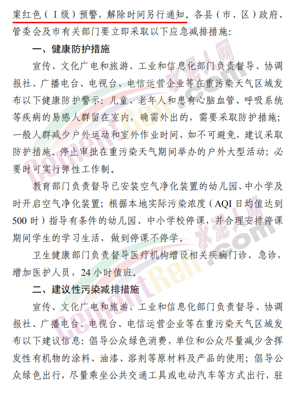 鄭州、開封、 洛陽(yáng)、平頂山、安陽(yáng)、鶴壁、新鄉(xiāng)、焦作、濮陽(yáng)、許昌等10個(gè)省轄市于11月10日22時(shí)啟動(dòng)重污染天氣紅色預(yù)警及I級(jí)響應(yīng)。漯河、三門峽、商丘、周口、駐馬店、南陽(yáng)、信陽(yáng)市和濟(jì)源示范區(qū)于11月10日22時(shí)啟動(dòng)重污染天氣橙色預(yù)警及II級(jí)響應(yīng)。對(duì)納入重污染天氣績(jī)效評(píng)級(jí)A級(jí)、績(jī)效引領(lǐng)和綠色發(fā)展排行榜排 名靠前以及民生保障類的企業(yè),在污染治理設(shè)施正常運(yùn)行、污染物穩(wěn)定達(dá)標(biāo)排放的情況下,原則上鼓勵(lì)企業(yè)實(shí)施自主減排和僅準(zhǔn)許從事特定保障任務(wù)的生產(chǎn)經(jīng)營(yíng);其他企業(yè)應(yīng)嚴(yán)格按照2020年重污染天氣應(yīng)急減排清單實(shí)施相應(yīng)級(jí)別管控措施。應(yīng)急搶險(xiǎn)、重大民生工程和重點(diǎn)項(xiàng)目,在嚴(yán)格落實(shí)“六個(gè)百分之百”施工要求 的前提下,可正常施工。 重污染天氣預(yù)警期間,請(qǐng)各地重點(diǎn)加強(qiáng)對(duì)城市建成區(qū)及周邊排污企業(yè)的管控力度,對(duì)應(yīng)停未停、應(yīng)限不限、預(yù)警前故意抬高排放量及用電量,或借“出于安全考慮無(wú)法停下來(lái)” “設(shè)備調(diào)試、 檢修”名義規(guī)避管控的企業(yè)依法依規(guī)嚴(yán)格處理。各地要主動(dòng)對(duì)社會(huì)發(fā)聲,提醒公眾做好健康防護(hù)措施,倡導(dǎo)公眾低碳生活、綠色消費(fèi),單位和公眾盡量減少含揮發(fā)性有機(jī)物的涂料、油漆、溶劑 等原材料和產(chǎn)品的使用,自覺接受社會(huì)監(jiān)督,同心協(xié)力做好重污 染天氣應(yīng)急應(yīng)對(duì)工作。通知原文如下: