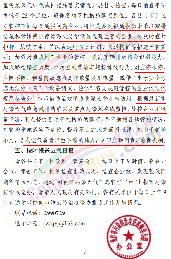 加強(qiáng)對(duì)重點(diǎn)用車企業(yè)的管控,提高車輛排放階段識(shí)別能力, 加大路檢路查力度,嚴(yán)厲查處柴油車超標(biāo)排放行為。對(duì)應(yīng)停未停、 應(yīng)限不限、預(yù)警前故意抬高排放量及用電量,或借“出于安全考慮無(wú)法停下來(lái)”“設(shè)備調(diào)試、檢修”名義規(guī)避管控的企業(yè)依法依規(guī)嚴(yán)格查處。市污染防治攻堅(jiān)辦將派出督導(dǎo)暗訪組,根據(jù)最新重污染天氣應(yīng)急減排清單以及重點(diǎn)污染源在線監(jiān)控、管控企業(yè)用電量情況,重點(diǎn)督促各項(xiàng)管控措施的落實(shí),每日通報(bào)各地管控情況,對(duì)管控措施落實(shí)不到位、督導(dǎo)不力的地方通報(bào)批評(píng),對(duì)由于管控不力,造成空氣質(zhì)量嚴(yán)重下滑的地方,立即啟動(dòng)問責(zé)、追責(zé)機(jī)制。