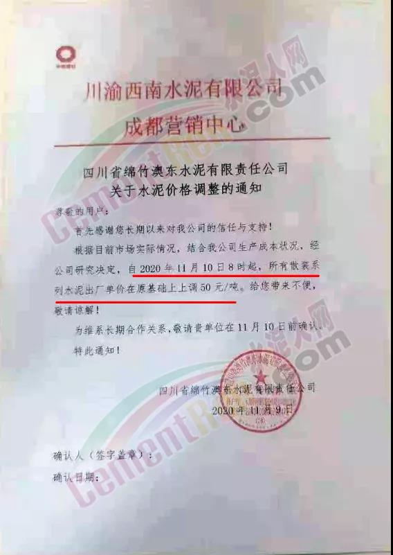 四川峨勝水泥通知自11月12日零時起,對成都區(qū)域所有袋裝水泥上調(diào)20元/噸。