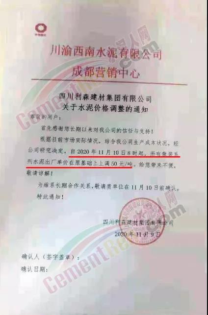 瀘州蘭良水泥有限公司通知自11月12日起,袋裝水泥統(tǒng)一上調(diào)20元/噸,散裝水泥價格統(tǒng)一上調(diào)30元/噸。