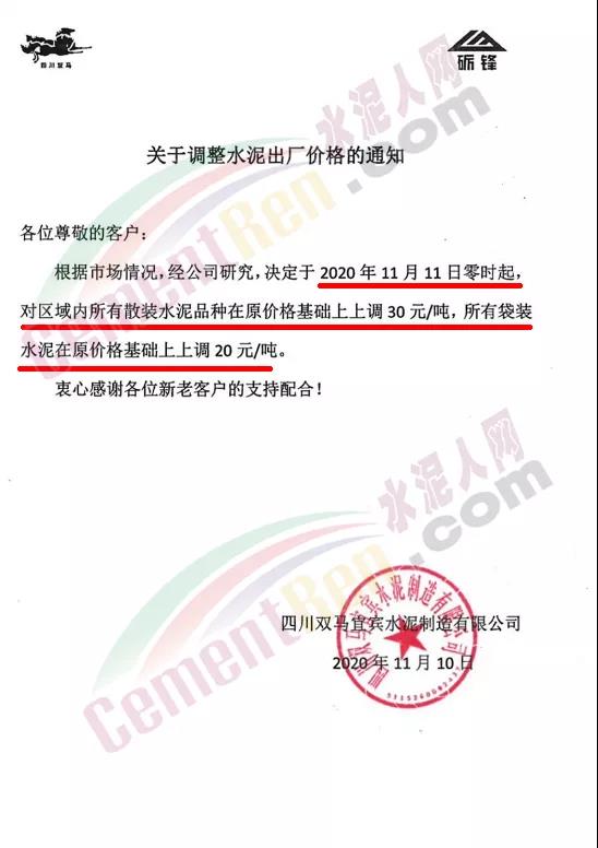 四川雙馬宜賓水泥通知11月11日零時起對區(qū)域內(nèi)所有散裝水泥上調(diào)30元/噸,所有袋裝水泥上調(diào)20元/噸。