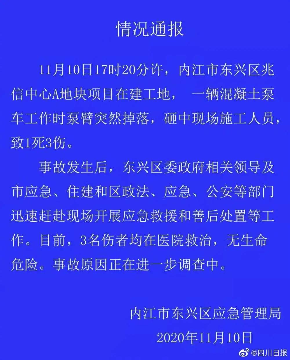 11月10日,有網(wǎng)友爆料稱,內(nèi)江市東興區(qū)兆信中心在建工地發(fā)生事故導(dǎo)致人員傷亡。記者從內(nèi)江市東興區(qū)應(yīng)急管理局處確認(rèn),11月10日17時(shí)20分許,內(nèi)江市東興區(qū)兆信中心A地塊項(xiàng)目在建工地,一輛混凝土泵車工作時(shí)泵臂突然掉落,砸中現(xiàn)場施工人員,致1死3傷。 內(nèi)江市東興區(qū)應(yīng)急管理局11月10日晚間發(fā)布情況通報(bào)稱,事故發(fā)生后,東興區(qū)委政府相關(guān)領(lǐng)導(dǎo)及市應(yīng)急、住建和區(qū)政法、應(yīng)急、公安等部門迅速趕赴現(xiàn)場開展應(yīng)急救援和善后處置等工作。目前,3名傷者均在醫(yī)院救治,無生命危險(xiǎn)。事故原因正在進(jìn)一步調(diào)查中。