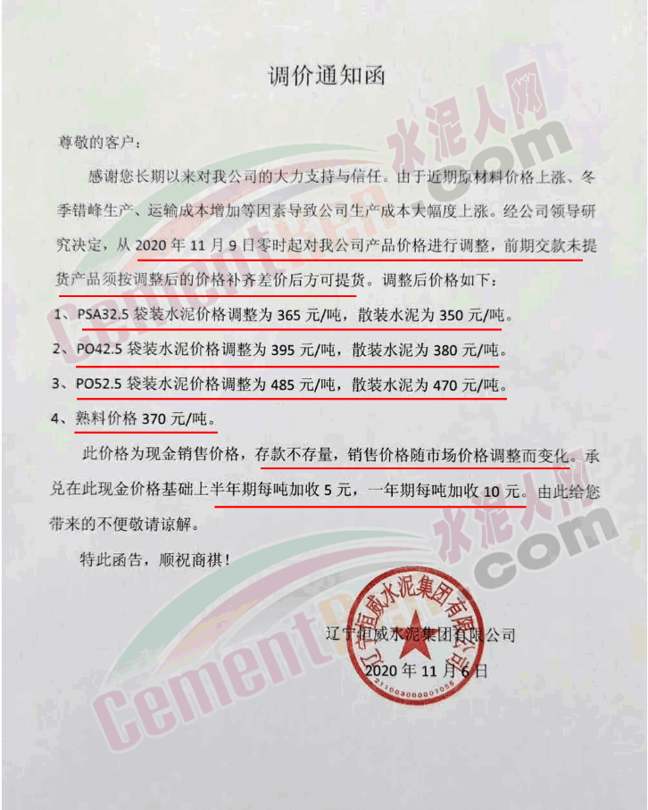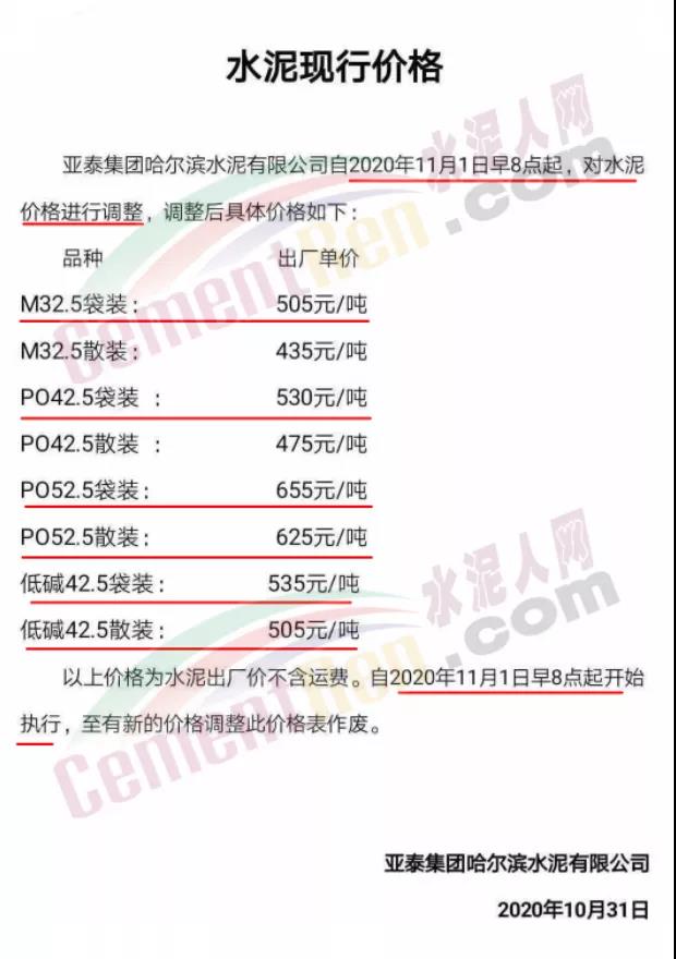 據(jù)水泥人網(wǎng)此前報(bào)道,近期多區(qū)域通知上調(diào)水泥價(jià)格,東北吉林某企業(yè)通知水泥價(jià)格一次性上調(diào)160元/噸,黑龍江主要品牌企業(yè)北方水泥、亞泰水泥一次性上調(diào)130~150元/噸。