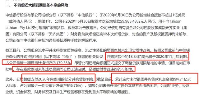 根據(jù)公告,天齊鋰業(yè)的18.84億美元(約合人民幣124.4億元)并購(gòu)貸款將于2020年11月底到期,存在無(wú)法及時(shí)、足額償付導(dǎo)致違約的可能性。