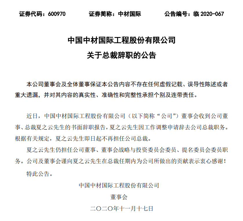 中國中材國際工程股份有限公司董事會收到公司董事、總裁夏之云先生的書面辭職報告,夏之云先生因工作調(diào)整申請辭去公司總裁職務(wù)。根據(jù)有關(guān)規(guī)定,夏之云先生即日起不再擔任公司總裁。