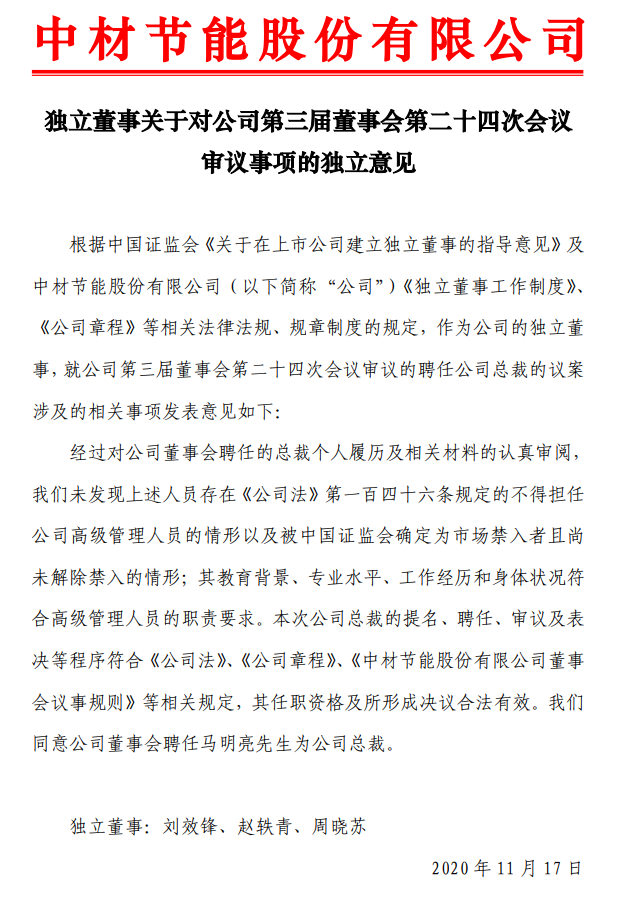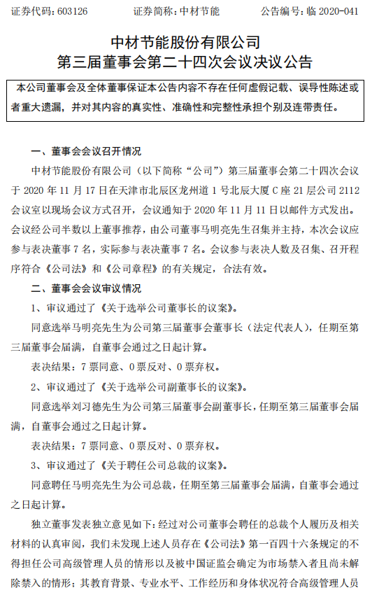 1、胡也明離職總裁職位,離職時間為2020年11月17日,離職原因為:工作變動。2、付貴平上任副總經(jīng)理職位,上任時間為2020年11月17日。3、馬明亮上任總裁職位,上任時間為2020年11月17日。中材節(jié)能股份有限公司是中材集團旗下從事余熱、余壓利用的余熱發(fā)電全方位服務(wù)商。中材節(jié)能致力于工業(yè)余熱、余壓的技術(shù)開發(fā)、綜合利用和產(chǎn)業(yè)化,擁有該領(lǐng)域及相關(guān)領(lǐng)域的設(shè)計、對外貿(mào)易經(jīng)營以及對外工程總承包等各類經(jīng)營資質(zhì),主要從事余熱發(fā)電項目的投資、技術(shù)開發(fā)、系統(tǒng)集成、工程設(shè)計、咨詢及工程總承包,提供清潔發(fā)展機制項目的開發(fā)方案及技術(shù)咨詢.中材節(jié)能也是經(jīng)國家商務(wù)部批準的承包境外低溫余熱發(fā)電系統(tǒng)工程和境內(nèi)國際招標工程等業(yè)務(wù)的公司。