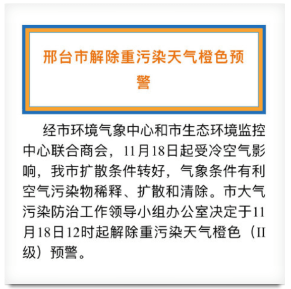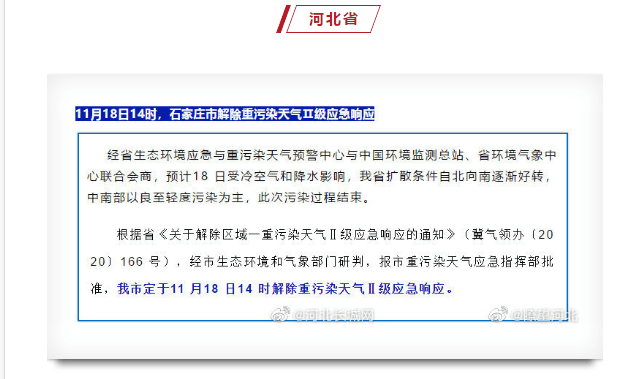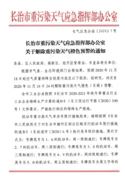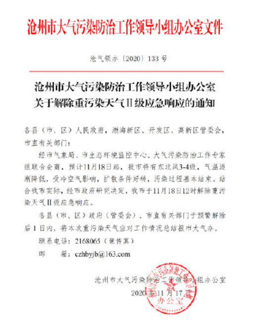 關(guān)于解除重污染天氣Ⅱ級(jí)響應(yīng)的通知