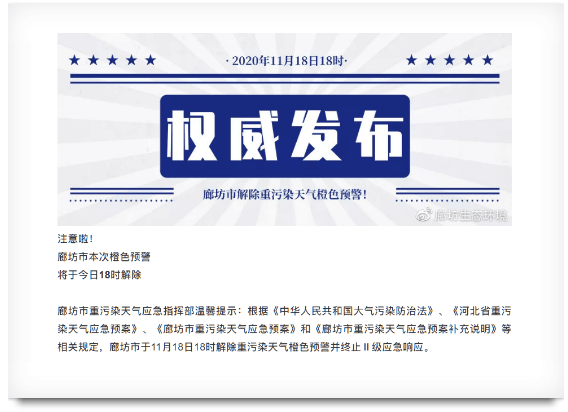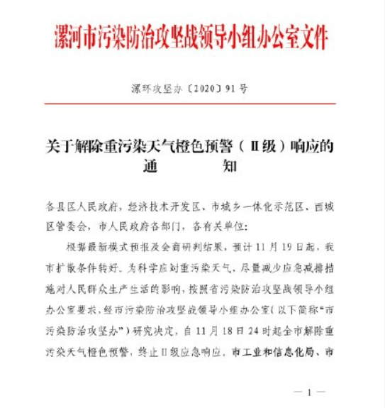 根據(jù)最新空氣質(zhì)量會(huì)商結(jié)果,我市氣象條件好轉(zhuǎn),決定自11月18日零時(shí)起,解除 11月10日發(fā)布的重污染天氣Ⅱ級(jí)響應(yīng)。請(qǐng)各開發(fā)區(qū)管委會(huì)、區(qū)縣(市)政府和市直相關(guān)單位嚴(yán)格按照《鄭州市2020-2021年秋冬季大氣污染綜合治理攻堅(jiān)行動(dòng)方案》和季節(jié)性生產(chǎn)調(diào)控要求,認(rèn)真落實(shí)各項(xiàng)管理措施。