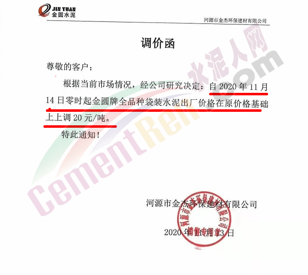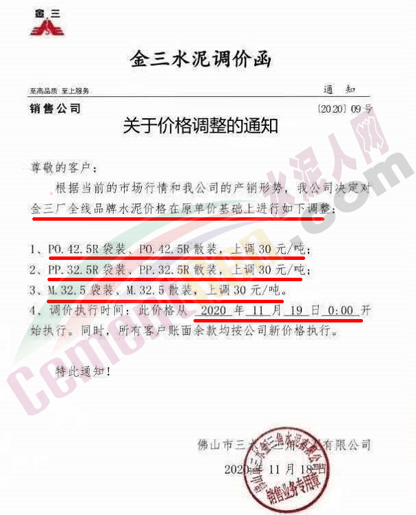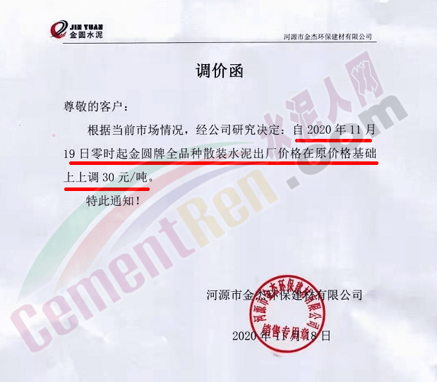 金圓水泥通知,11月19日0時各品種散裝水泥上調(diào)30元/噸,本月14日,金圓水泥還曾上調(diào)全品種袋裝水泥20元/噸。
