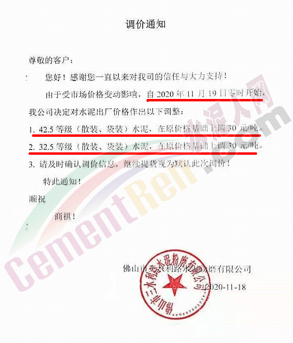 廣東鴻豐水泥通知自今日(19日)0時起,上調(diào)各標號散裝水泥報價30元/噸。