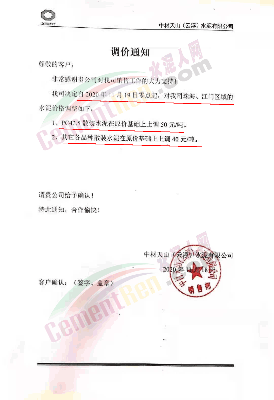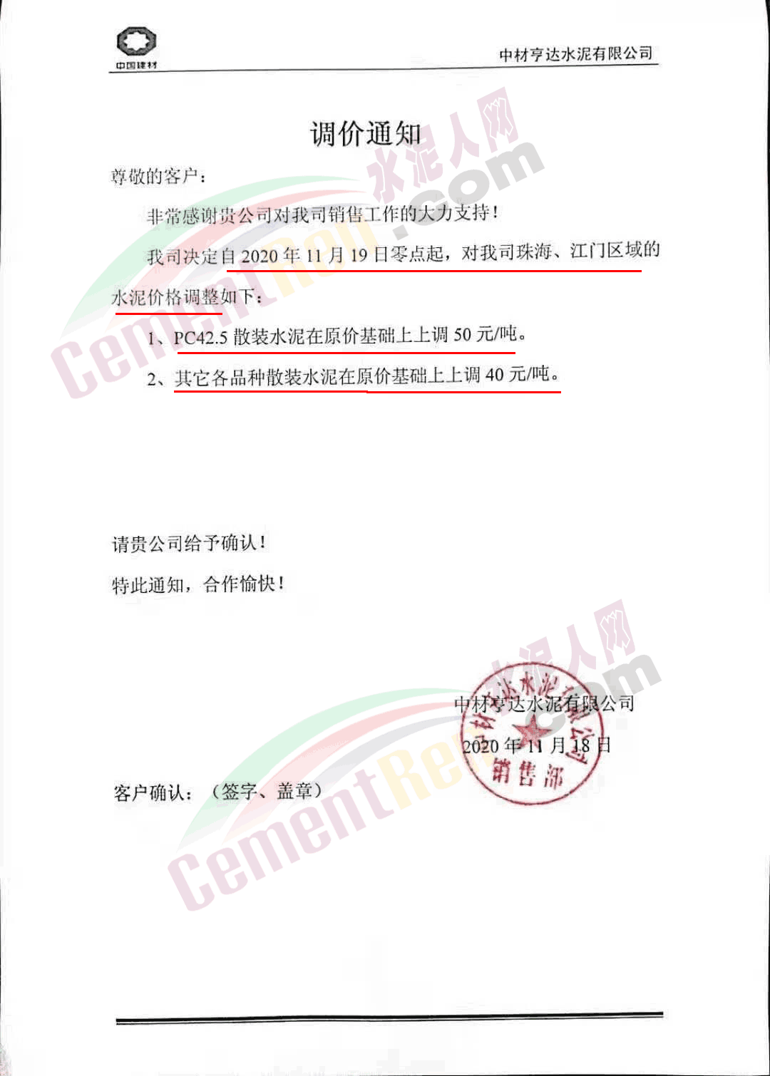臺泥英德水泥有限公司通知,因庫存偏低,英德廠及貴港廠下珠三角的水泥散裝品種價格進行調(diào)整 。其中粵北及珠三角區(qū)域高標號散裝水泥上調(diào)30元/噸,PC42.5散裝水泥上調(diào)40元/噸。珠海/江門區(qū)域高標號散裝水泥上調(diào)40元/噸,PC42.5散裝水泥上調(diào)50元/噸。自今日(19日)0時起執(zhí)行。調(diào)價含中轉(zhuǎn)庫交貨。