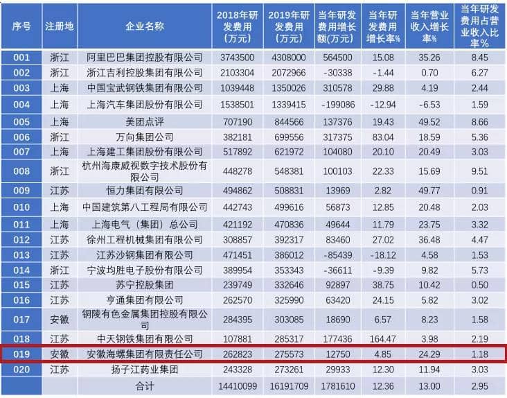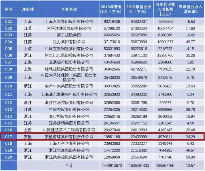 該榜單以2019年企業(yè)營(yíng)業(yè)收入為入圍標(biāo)準(zhǔn),由長(zhǎng)三角三省一市企業(yè)聯(lián)合會(huì)共同發(fā)布。海螺集團(tuán)位列長(zhǎng)三角企業(yè)百?gòu)?qiáng)榜第17位,盈利榜第15位,研發(fā)費(fèi)用的投入榜第19位。