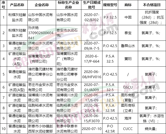 11月6日山東省市場監(jiān)督管理局網(wǎng)站公布2020年水泥產(chǎn)品質(zhì)量省級監(jiān)督抽查結(jié)果, 發(fā)現(xiàn)10家企業(yè)的10批次產(chǎn)品不符合相關(guān)標(biāo)準(zhǔn)的要求,不合格項(xiàng)目為氯離子、燒失量、28d強(qiáng)度、水泥溶性鉻(VI)項(xiàng)目。