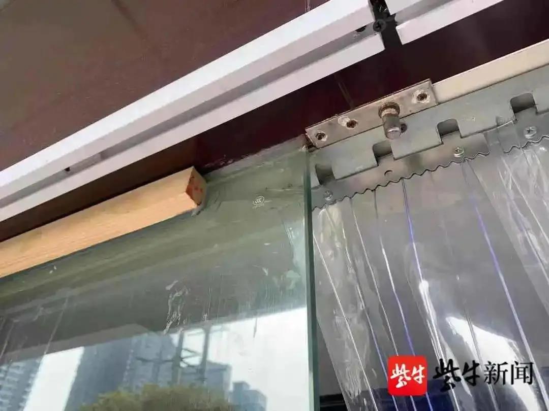 他還告訴記者,他們都認為是地面沉降形成的高度差造成門上端的固定裝置與玻璃門扇脫離。記者隨著他的指引看到,旁邊落地玻璃墻的上端已與房頂?shù)墓潭ńY(jié)構(gòu)脫離,用木條臨時加以固定。