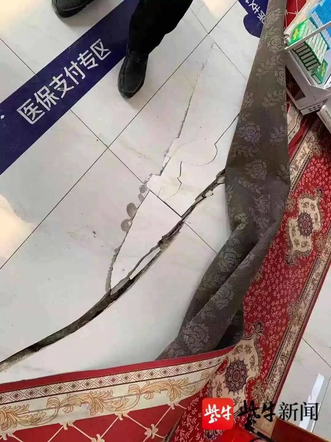“大概是從八月份開始出現(xiàn)裂縫的,后面越來越嚴重,一天一個樣!”藥房經(jīng)理施先生掀起地面上的地毯,地磚上一條貫穿店鋪的裂縫出現(xiàn)在記者眼前。記者親手測試,裂縫的寬度可以插入兩根手指,用卷尺測量,同樣有3.5厘米左右的高度差。