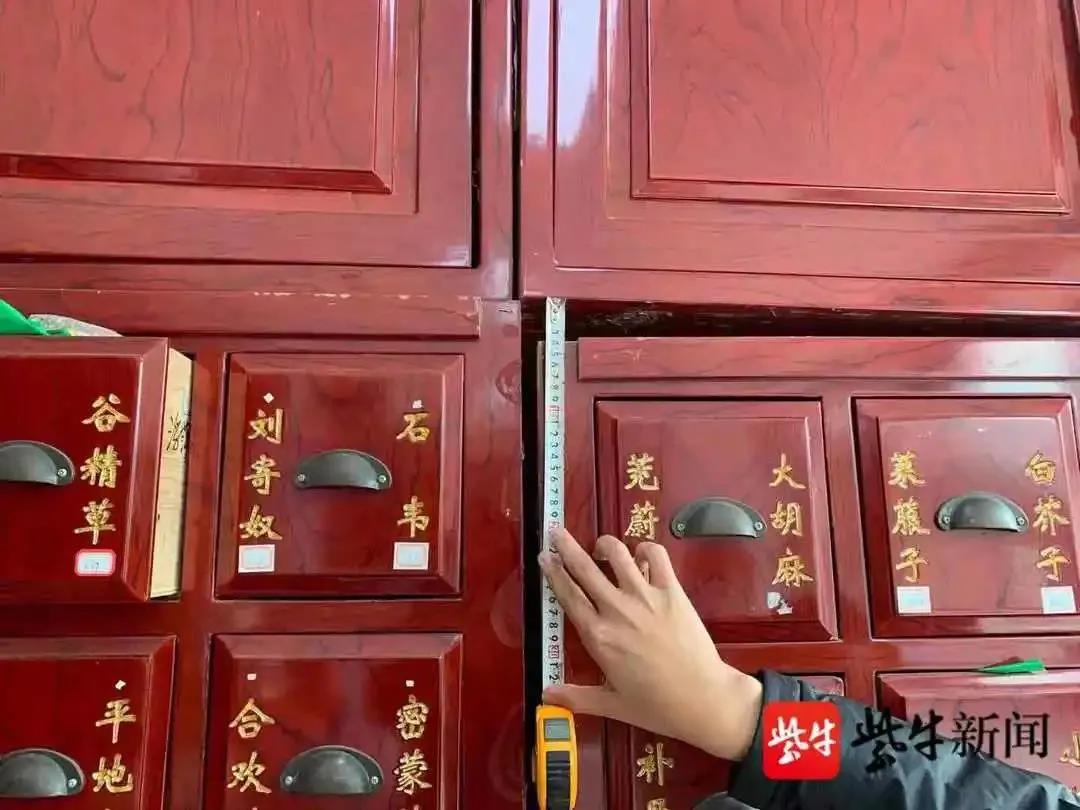 藥房東面靠墻并排放著兩個相同的中藥柜,因為地面沉降,兩個柜子上端的高度差已經(jīng)達到3.8厘米。而西側(cè)墻邊的收銀臺上方,一塊吊頂材料落下半邊,擔(dān)在柜子上方。兩名店員擠在收銀臺離裂縫較遠的一端,“哪能不怕呢,就擔(dān)心突然有什么東西掉下來。”其中一個店員說。