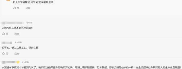 “很可怕,都怎么開(kāi)車的,保持車距。”“水泥罐車事故我今年看到幾次了,說(shuō)實(shí)話這些開(kāi)罐車的確實(shí)開(kāi)得快,馬路上喇叭隨便按,見(jiàn)車就超,好像公路是他家的一樣!完全沒(méi)把其他車輛和行人的生命放在眼里!”“和大貨車碰撞任何車在它面前都是紙。”