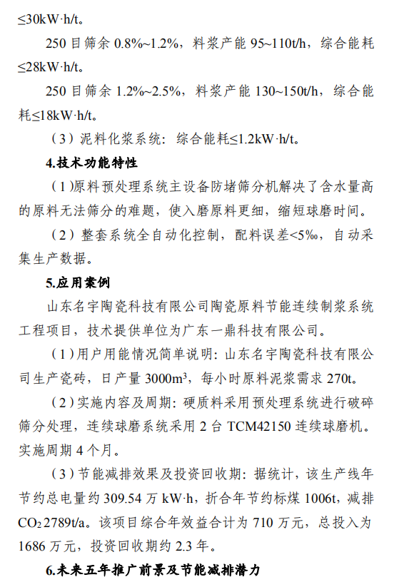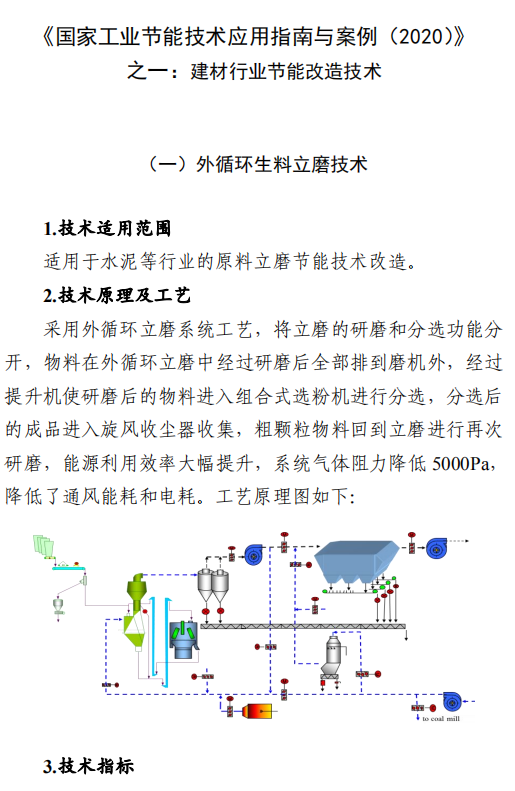 之一:建材行業(yè)節(jié)能改造技術(shù)外循環(huán)生料立磨節(jié)能技術(shù),采用外循環(huán)立磨系統(tǒng)工藝,將立磨的研磨和分選功能分開(kāi),系統(tǒng)氣體阻力降低5000Pa,通風(fēng)能耗和電耗降低,粉磨系統(tǒng)電耗降低3-4kW·h/t,能源利用效率大幅提升。在湖北京蘭(永興)水泥有限公司改造項(xiàng)目中,系統(tǒng)產(chǎn)量提升約10%,系統(tǒng)電耗降低4.47kW·h/t,年節(jié)約電量約756萬(wàn)kW·h,折合年節(jié)約標(biāo)煤2457t,減排二氧化碳6812t/a。鋼渣/礦渣輥壓機(jī)終粉磨系統(tǒng)節(jié)能技術(shù),以輥壓機(jī)和動(dòng)靜組合式選粉機(jī)為核心設(shè)備,輥面壽命可達(dá)立磨的2倍,具有廣泛的物料適應(yīng)性;全部物料為外循環(huán),除鐵方便,避免塊狀金屬富集;系統(tǒng)阻力低,節(jié)電效果明顯,礦渣微粉生產(chǎn)的系統(tǒng)電耗<35kW·h/t。在邯鄲市邦信建材有限公司礦渣粉磨及儲(chǔ)存(30萬(wàn)t/a)項(xiàng)目中,鋼渣/礦渣輥壓機(jī)終粉磨系統(tǒng)年節(jié)約電量約120萬(wàn)kW·h,折合年節(jié)約標(biāo)煤390t,減排二氧化碳1081t/a。陶瓷原料連續(xù)制漿系統(tǒng)節(jié)能技術(shù),采用自動(dòng)精確連續(xù)配料、原料預(yù)處理系統(tǒng)、泥料/黏土連續(xù)化漿系統(tǒng)、連續(xù)式球磨方法等關(guān)鍵技術(shù),實(shí)現(xiàn)自動(dòng)配料和自動(dòng)出漿的功能,原料預(yù)處理系統(tǒng)綜合能耗≤4kW·h/t,250目篩余0.7%-0.9%、料漿產(chǎn)能85-100t/h連續(xù)球磨系統(tǒng)綜合能耗≤30kW·h/t,泥料化漿系統(tǒng)綜合能耗≤1.2kW·h/t,節(jié)能效果顯著。山東名宇陶瓷科技有限公司陶瓷原料節(jié)能連續(xù)制漿系統(tǒng)改造項(xiàng)目,生產(chǎn)線年節(jié)約總電量約309.54萬(wàn)kW·h,折合年節(jié)約標(biāo)煤1006t,減排二氧化碳2789t/a。帶中段輥破的列進(jìn)式冷卻機(jī)節(jié)能技術(shù),采用區(qū)域供風(fēng)急冷技術(shù)并在冷卻機(jī)中段設(shè)置了高溫輥式破碎機(jī),使大塊紅料得到充分破碎,落入到第二段篦床冷卻后,以較低的溫度排出,熱回收效率高,可降低燒成系統(tǒng)熱耗,平均每噸熟料節(jié)約標(biāo)煤2kg。在泰安中聯(lián)水泥有限公司5000t/d新型干法水泥工程項(xiàng)目中,系統(tǒng)運(yùn)行穩(wěn)定,年節(jié)約標(biāo)煤4108t,減排二氧化碳1.14萬(wàn)t/a。臥式玻璃直線四邊砂輪式磨邊技術(shù),采用多軸伺服電機(jī)聯(lián)動(dòng)技術(shù),精確控制各移動(dòng)部件定位以及磨輪相對(duì)于玻璃的移動(dòng)速度,磨邊速度15-30m/min,玻璃所需磨邊時(shí)間平均20s/m2,可同時(shí)完成玻璃的四條邊打磨,提升了玻璃棱邊加工的效率。在廣宇洛玻(北京)工業(yè)玻璃有限公司改造項(xiàng)目中,該項(xiàng)目年節(jié)約標(biāo)煤46.8t,減排二氧化碳1170t/a。新型水泥熟料冷卻技術(shù)及裝備,采用新型前吹高效篦板、高效急冷斜坡、高溫區(qū)細(xì)分供風(fēng)、新型高溫耐磨材料、智能化“自動(dòng)駕駛”、新型流量調(diào)節(jié)閥等技術(shù),熱回收效率高、輸送運(yùn)轉(zhuǎn)率高、磨損低。在淶水冀東水泥有限公司篦冷機(jī)改造項(xiàng)目中,噸熟料工序電耗下降2.57kW·h,每年可節(jié)電370萬(wàn)kW·h,折合標(biāo)煤1202.5t,工序標(biāo)煤耗下降2.81kg/tcl,每年可節(jié)約5100tce,余熱發(fā)電年增加發(fā)電量570萬(wàn)kW·h,折合標(biāo)煤1852.5t。綜合年節(jié)約標(biāo)煤8155t,減排二氧化碳2.26萬(wàn)t/a。