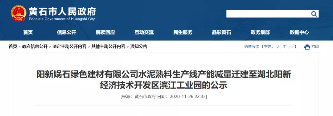 日前,黃石市人民政府發(fā)布一則產能置換公示稱,按照相關文件要求為進一步加快水泥產業(yè)結構調整和轉型升級,提升產業(yè)集中度,陽新媧石綠色建材有限公司擬將該企業(yè)實際控制的三條水泥熟料生產線產能減量遷建至湖北陽新經濟技術開發(fā)區(qū)濱江工業(yè)園。公示原文如下:
