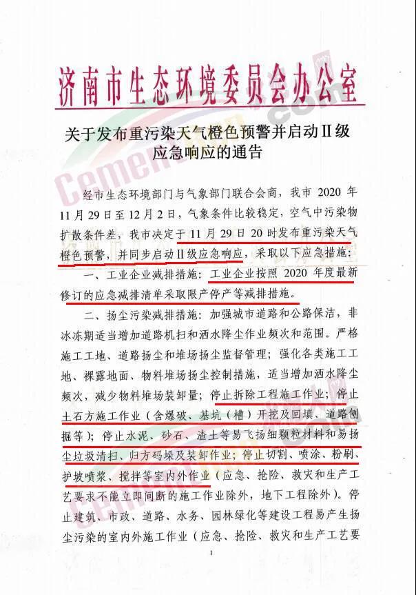 同日,日照市重污染天氣應急指揮部辦公室發(fā)布重污染天氣黃色預警啟動Ⅲ級應急響應的通知稱,根據(jù)市污染防治攻堅戰(zhàn)集中攻堅行動工作專班辦公室專家團隊分析研判和建議,日照市重污染天氣應急指揮部決定自2020年11月29日12時發(fā)布重污染天氣黃色預警,11月30日12時啟動Ⅲ級應急響應。強制性減排措施要求:(一)納入應急減排清單的工業(yè)企業(yè)嚴格依法落實重污染天氣應急預案、應急減排清單確定的減排措施。(二)礦山、砂石料場、石材廠、石板廠等停止露天作業(yè)。(三)未納入保障類減排清單的施工工地禁止土石方作業(yè)、建筑拆除、噴涂粉刷、護坡噴漿、混凝土攪拌等。(四)全市主要道路落實深度保潔措施,確保路面不起塵。灑水降塵作業(yè)應根據(jù)雨雪、冰凍等特殊氣象條件,進行科學調(diào)整。(五)未安裝密閉裝置易產(chǎn)生遺撒的煤炭、渣土、砂石料等運輸車輛禁止上路。(六)除城市運行保障車輛和執(zhí)行特種任務(wù)車輛外,城市主城區(qū)、縣城區(qū)內(nèi)禁止低速載貨汽車、三輪汽車、拖拉機等通行。(七)港口碼頭停止木薯干、粉煤、粉礦等極易起塵物料作業(yè)。(八)嚴格落實煙花爆竹禁放措施。