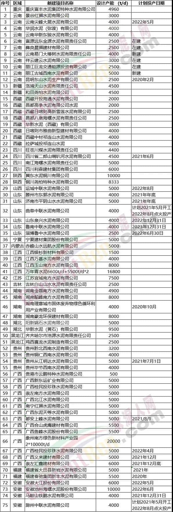 截止目前,包括已建成和在建項(xiàng)目國內(nèi)已經(jīng)有20條以上日產(chǎn)萬噸水泥生產(chǎn)線了。據(jù)水泥人網(wǎng)不完全統(tǒng)計(jì),近兩年公示公告且在2020~2023年內(nèi)投產(chǎn)的項(xiàng)目約75條生產(chǎn)線,產(chǎn)能合計(jì)共11087.79萬噸/年。近日,又有15個(gè)新建粉磨站落地,項(xiàng)目投建方包括中聯(lián)、西南、華新、堯柏等多家集團(tuán)企業(yè),合計(jì)產(chǎn)能共3355萬噸/年,部分新建產(chǎn)能名單如下: