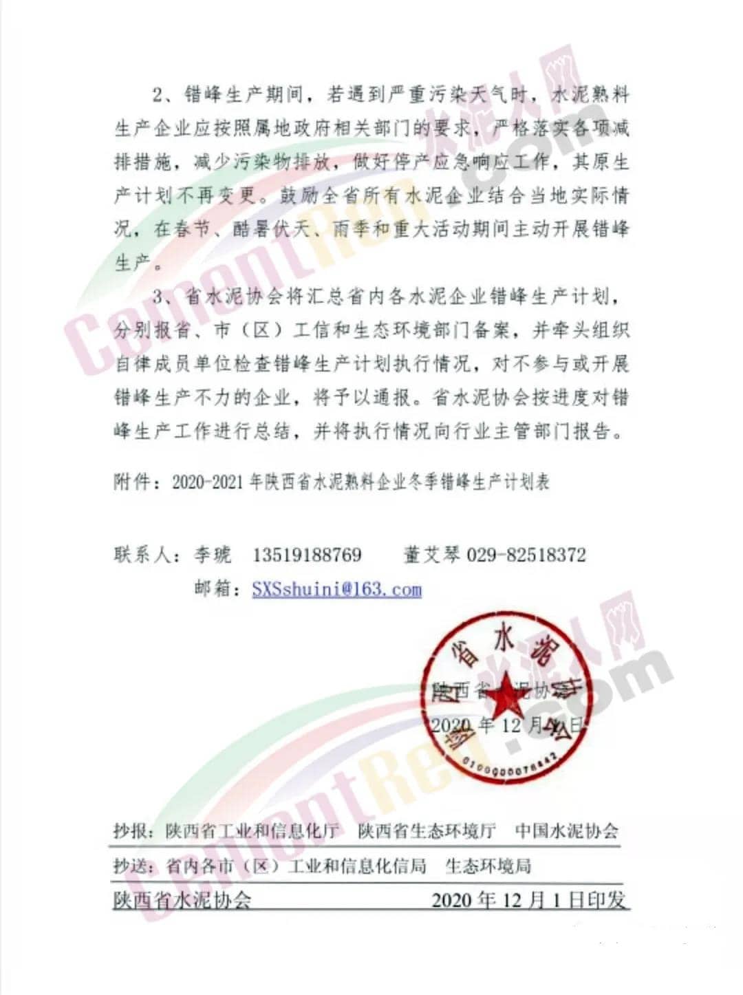一、錯峰生產(chǎn)時間2020年12月10日—--2021年2月28日(冬季錯峰生產(chǎn)80天),7月——9月(夏季錯峰生產(chǎn)30天)二、實施范圍關(guān)中地區(qū),所有水泥熟料生產(chǎn)線全部實行冬季錯峰生產(chǎn)80天,夏季錯峰生產(chǎn)30天。確有必要承擔居民供暖、協(xié)同處置城市生活垃圾及有毒有害廢棄物等任務(wù)的生產(chǎn)線,要核定最低生產(chǎn)負荷和運行時間,并要在非采暖季和非錯峰生產(chǎn)期間補足錯峰時間。陜北地區(qū),所有水泥熟料生產(chǎn)線參照關(guān)中地區(qū)錯峰生產(chǎn)方案執(zhí)行,利用電石渣生產(chǎn)水泥熟料企業(yè),應(yīng)核定最低生產(chǎn)負荷,錯峰時間不足的,應(yīng)通過與當?shù)胤请娛a(chǎn)企業(yè)"錯峰置換"或采取在非采暖季、非錯峰生產(chǎn)時間補足錯峰時間的辦法參與錯峰生產(chǎn),全年錯峰時間不少于100天。陜南地區(qū),屬非采暖地區(qū),所有水泥熟料生產(chǎn)線應(yīng)嚴格按照屬地政府相關(guān)部門的要求,降低生產(chǎn)負荷,參照關(guān)中地區(qū)制定錯峰生產(chǎn)方案。三、保障措施1、各水泥熟料生產(chǎn)企業(yè)要切實做好冬季錯峰生產(chǎn)計劃工作。確有必要承擔居民供暖、協(xié)同處置城市生活垃圾及有毒有害廢棄物等任務(wù)的生產(chǎn)線,務(wù)必于12月10日前將錯峰生產(chǎn)計劃報省水泥協(xié)會。錯峰生產(chǎn)期間生產(chǎn)的水泥熟料應(yīng)以滿足本地需求為主,嚴禁跨區(qū)域傾銷,破壞其它地區(qū)錯峰生產(chǎn)工作。2、錯峰生產(chǎn)期間,若遇到嚴重污染天氣時,水泥熟料生產(chǎn)企業(yè)應(yīng)按照屬地政府相關(guān)部門的要求,嚴格落實各項減排措施,減少污染物排放,做好停產(chǎn)應(yīng)急響應(yīng)工作,其原生產(chǎn)計劃不再變更。鼓勵全省所有水泥企業(yè)結(jié)合當?shù)貙嶋H情況,在春節(jié)、酷暑伏天、雨季和重大活動期間主動開展錯峰生產(chǎn)。3、省水泥協(xié)會將匯總省內(nèi)各水泥企業(yè)錯峰生產(chǎn)計劃,分別報省、市(區(qū))工信和生態(tài)環(huán)境部門備案,并牽頭組織自律成員單位檢查錯峰生產(chǎn)計劃執(zhí)行情況,對不參與或開展錯峰生產(chǎn)不力的企業(yè),將予以通報。省水泥協(xié)會按進度對錯峰生產(chǎn)工作進行總結(jié),并將執(zhí)行情況向行業(yè)主管部門報告。通知原文如下: