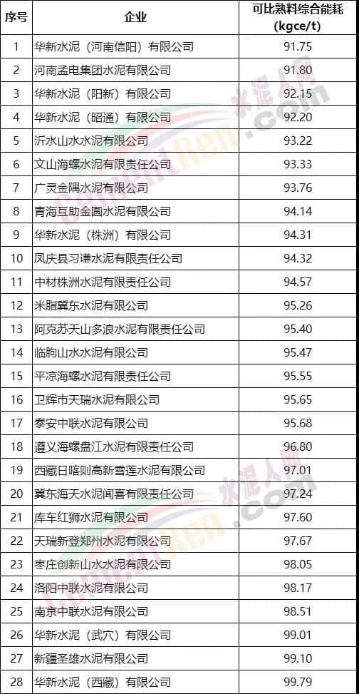 2020 年度重點用能行業(yè)能效“領(lǐng)跑者”擬入選企業(yè)名單中包括華新水泥、孟電水泥、海螺水泥、金圓水泥、中材水泥、中聯(lián)水泥、冀東水泥、天瑞水泥在內(nèi)的28家水泥企業(yè),詳情名單如下: