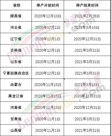 隨著北方多區(qū)域進(jìn)入采暖季,為避免與供熱鍋爐排放疊加污染,陜西,河北,內(nèi)蒙古,遼寧,吉林,山東,甘肅,黑龍江,山西,河南等多區(qū)域相繼發(fā)布水泥行業(yè)錯(cuò)峰生產(chǎn)通知。據(jù)水泥人網(wǎng)不完全統(tǒng)計(jì), 河北、山東、遼寧、吉林、寧夏等多區(qū)域自12月1日起錯(cuò)峰停產(chǎn),絕大多數(shù)區(qū)域?qū)⑼.a(chǎn)至2020年3月底。涉及水泥企業(yè)600多家。近期發(fā)布的各區(qū)域錯(cuò)峰生產(chǎn)時(shí)間表如下: