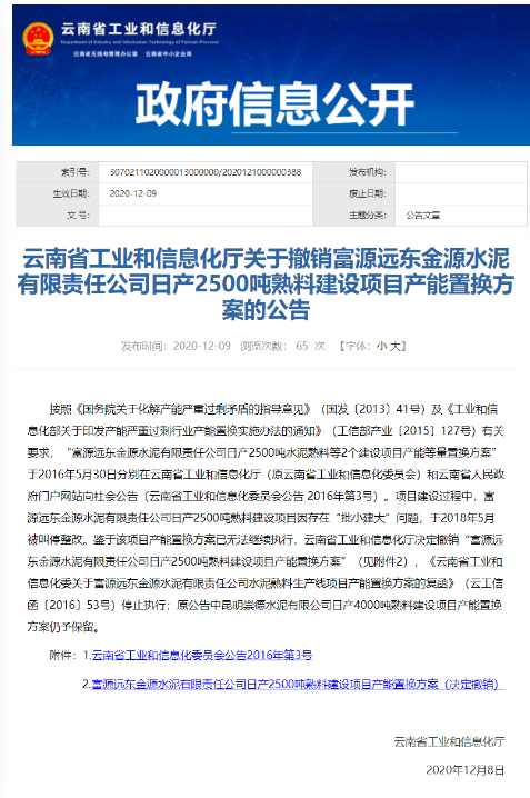 日前,云南省工信廳發(fā)布《關(guān)于撤銷富源遠東金源水泥有限責任公司日產(chǎn)2500噸熟料建設(shè)項目產(chǎn)能置換方案的公告》提到,富源遠東金源水泥有限責任公司日產(chǎn)2500噸熟料建設(shè)項目因存在“批小建大”問題,于2018年5月被叫停整改。鑒于該項目產(chǎn)能置換方案已無法繼續(xù)執(zhí)行,云南省工業(yè)和信息化廳決定撤銷“富源遠東金源水泥有限責任公司日產(chǎn)2500噸熟料建設(shè)項目產(chǎn)能置換方案”。公告原文如下: