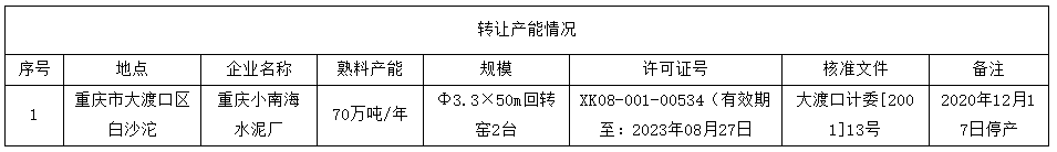 標(biāo)的系70萬(wàn)噸/年干法水泥熟料生產(chǎn)線產(chǎn)能指標(biāo),擬按現(xiàn)狀以不低于轉(zhuǎn)讓底價(jià)11000萬(wàn)元協(xié)議或競(jìng)價(jià)整體轉(zhuǎn)讓,標(biāo)的基本情況如下: