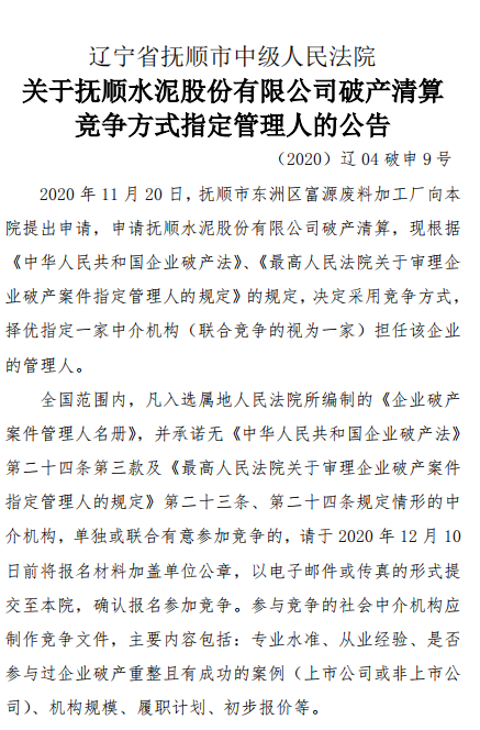 一、遼寧撫順?biāo)喙煞萦邢薰敬娈a(chǎn)清算競(jìng)爭(zhēng)方式指定管理人