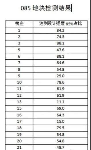 據(jù)了解,此前業(yè)主與開發(fā)商共同選定了5家檢測(cè)單位,對(duì)已經(jīng)封頂?shù)?0棟建筑進(jìn)行了檢測(cè)。但每家每戶的檢測(cè)報(bào)告中,都有相同的一句話--“不符合設(shè)計(jì)要求,達(dá)不到使用要求”。