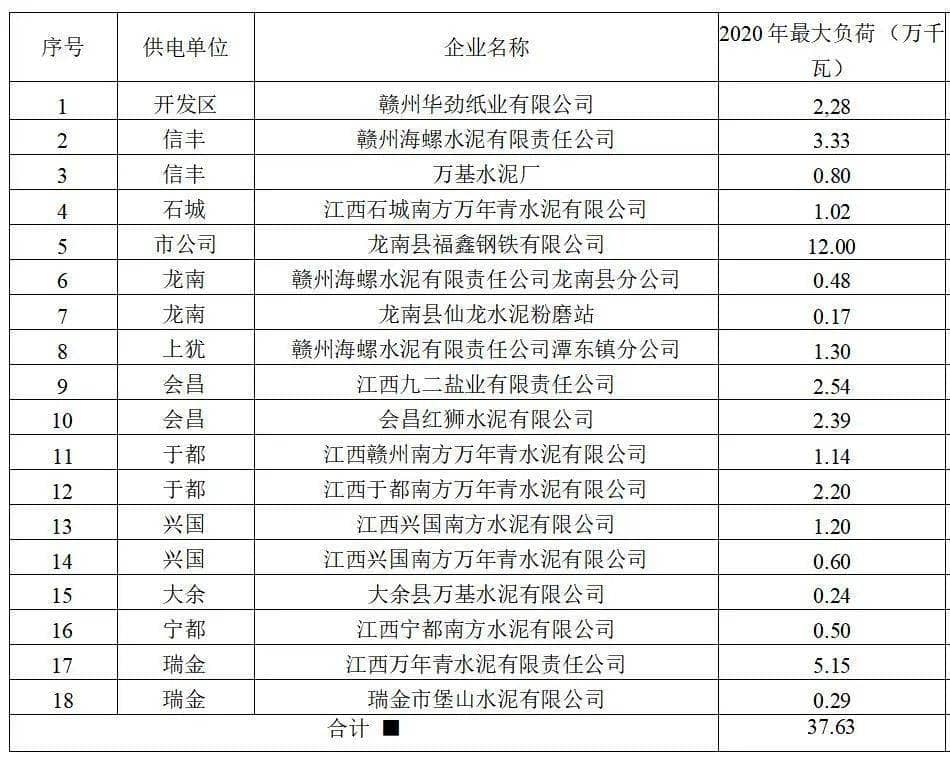 江西瑞金萬(wàn)年青水泥有限責(zé)任公司、江西興國(guó)南方水泥有限公司、江西贛州南方萬(wàn)年青水泥有限公司、江西于都南方萬(wàn)年青水泥有限公司、贛州海螺水泥有限責(zé)任公司、會(huì)昌紅獅水泥有限公司、江西九二鹽業(yè)有限責(zé)任公司、贛州華勁紙業(yè)有限公司、江西朝盛礦業(yè)有限 公司等9家有 自備發(fā)電機(jī)組的用戶做到穩(wěn)發(fā)滿發(fā)。