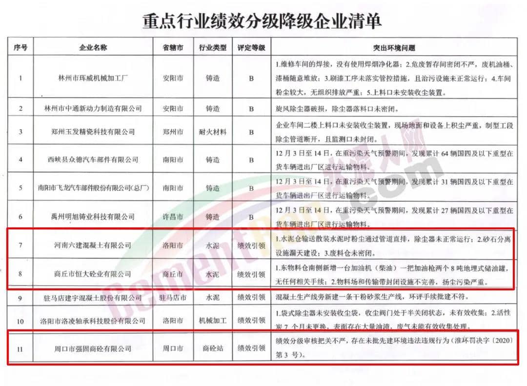 12月17日,省污染防治攻堅(jiān)辦印發(fā)通報(bào),對(duì)部分重點(diǎn)行業(yè)績(jī)效分級(jí)企業(yè)實(shí)施降級(jí)處理。通報(bào)指出,11月份以來(lái),省秋冬季大氣污染防治攻堅(jiān)暗訪檢查發(fā)現(xiàn),6家績(jī)效分級(jí)B級(jí)企業(yè)和5家績(jī)效引領(lǐng)企業(yè),存在治污設(shè)施不正常運(yùn)行、無(wú)組織排放嚴(yán)重、管控措施落實(shí)不力及在重污染天氣預(yù)警期間違規(guī)使用國(guó)四及以下車(chē)輛等環(huán)境突出問(wèn)題。經(jīng)省污染防治攻堅(jiān)戰(zhàn)領(lǐng)導(dǎo)小組辦公室研究決定,取消上述6家績(jī)效分級(jí)B級(jí)企業(yè)資格,降為C級(jí)企業(yè);取消上述5家績(jī)效引領(lǐng)企業(yè)資格。