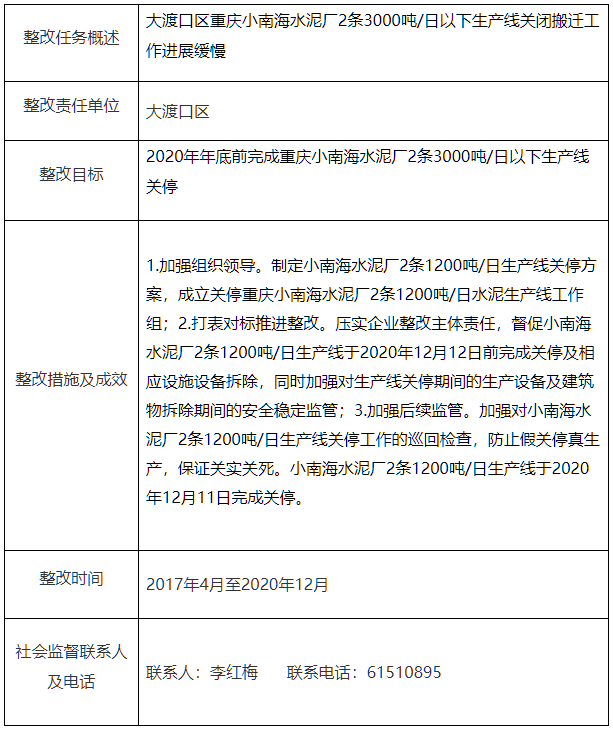 日前,重慶市大渡口區(qū)生態(tài)環(huán)境局,重慶小南海水泥廠2條1200噸日生產(chǎn)線整改銷號(hào)情況公示表。其中整改措施及成效一項(xiàng)顯示: 此次整改措施包括制定小南海水泥廠2條1200噸/日生產(chǎn)線關(guān)停方案,成立關(guān)停重慶小南海水泥廠2條1200噸/日水泥生產(chǎn)線工作組;打表對(duì)標(biāo)推進(jìn)整改。壓實(shí)企業(yè)整改主體責(zé)任,督促小南海水泥廠2條1200噸/日生產(chǎn)線于2020年12月12日前完成關(guān)停及相應(yīng)設(shè)施設(shè)備拆除,同時(shí)加強(qiáng)對(duì)生產(chǎn)線關(guān)停期間的生產(chǎn)設(shè)備及建筑物拆除期間的安全穩(wěn)定監(jiān)管;加強(qiáng)后續(xù)監(jiān)管。加強(qiáng)對(duì)小南海水泥廠2條1200噸/日生產(chǎn)線關(guān)停工作的巡回檢查,防止假關(guān)停真生產(chǎn),保證關(guān)實(shí)關(guān)死。小南海水泥廠2條1200噸/日生產(chǎn)線于2020年12月11日完成關(guān)停。