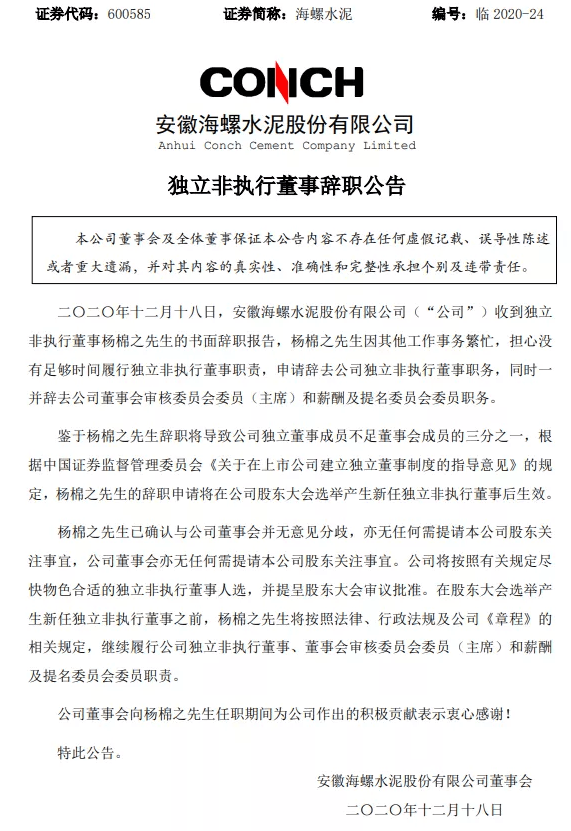 日前,海螺水泥(00914.HK)宣布,公司在2020年12月18日收到獨(dú)立非執(zhí)行董事楊棉之提出的書(shū)面辭職申請(qǐng)。